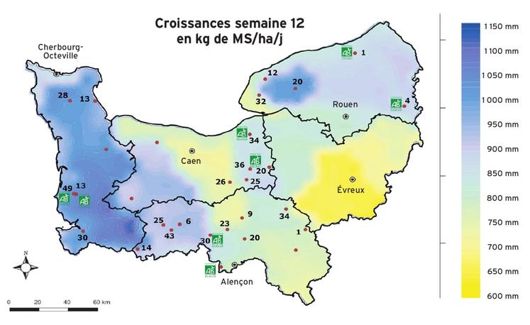 Les situations de stocks d'herbe sur pied sont très différentes d'un site à l'autre. La moyenne des hauteurs d'herbe sur le circuit de pâturage des sites normands est de 7,4 cm. Elle va de 5 cm pour le site avec le stock le plus faible à 10,7 cm pour le stock le plus élevé.