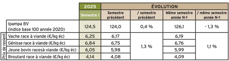 Pour rappel, la méthode s'appuie sur un échantillon constant de 118 fermes en bovins viande des réseaux d'élevage Inosys, naisseurs et naisseurs-engraisseurs de bovins de races charolaises et limousines, sur la période de référence 2014-2016. Par ailleurs, les indicateurs sont mis à jour semestriellement par la mise à jour des charges indicées à travers l'Ipampa viande bovine (mensuellement), des charges supplétives à travers la valeur du Smic (à chaque revalorisation), le taux du Livret A (idem) et la valeur du fermage (annuellement), et, côté produit, par l'évolution moyenne des aides de la Pac (annuellement).