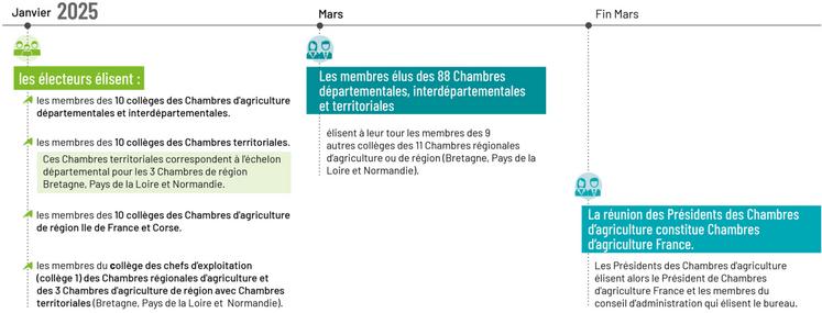 Le pouvoir exécutif des Chambres d'agriculture est issu d'élections professionnelles qui ont lieu tous les six ans. Afin de leur assurer une représentativité incontestable toutes les composantes du monde agricole réparties en collège sont appelées à s'exprimer par un vote en ligne ou par voie postale.