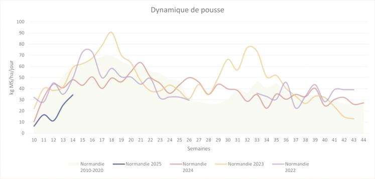 Les valeurs de croissance varient de 7 kg de MS/ha/j sur certains sites jusqu'à 67 dans la Manche. La moyenne est de 36,8 kg de MS/ha/j. Elle est donc inférieure de 22,2 kg de MS/ha/j par rapport à la moyenne normande 2010-2020 en semaine 14.•