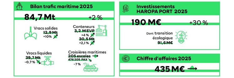Le chiffre d'affaires provisoire 2025 de Haropa Port a été annoncé lors de la conférence de presse du 21 janvier dernier : il est de 435 M€ contre 436 M€ en 2024. " C'est une année record. Dans un contexte géopolitique compliqué, Haropa Port montre qu'il est un modèle robuste. Et nos perspectives 2026 sont aujourd'hui positives avec une prévision budgétaire à 443 M€ ", précise Christophe Berthelin, directeur général adjoint comptabilité et finance de Haropa Port.