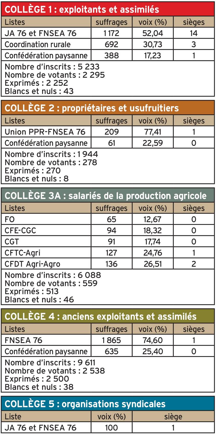 FNSEA 76 obtient 52,04 % des suffrages et récolte 14 sièges, sur les 18 sièges attribués (voir la liste des élus ci-dessous).