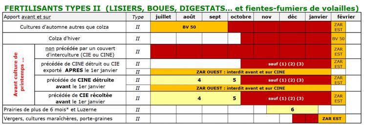 Par défaut, sur les parcelles avec couverts d'interculture avant culture de printemps, il est maintenant interdit d'épandre des fertilisants organiques du 15/11 au 15/01 pour les types I (fumiers...), du 15/10 au 31/01 en général pour les types II (lisiers, boues, fumiers de volailles...). La période s'allonge dans certaines zones d'actions renforcées.
