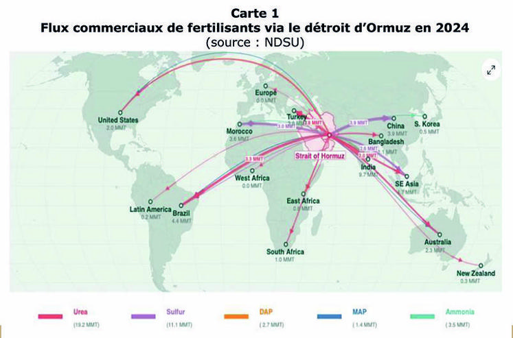 "Le troisième indicateur est celui des engrais. On rappelle ici que 30 à 40 % de l’urée, 16 % du phosphate, et plus de 25 % de l’ammonitrate transitent par le détroit d’Ormuz. Par comparaison avec la période de guerre, ce ne sont pas moins de 39 millions de tonnes d’engrais qui ont transité par ce détroit en 2024 (carte 1). Toutefois, l’Union européenne n’est pas la zone la plus exposée à la contraction des flux commerciaux d’engrais du fait du blocage d’Ormuz."