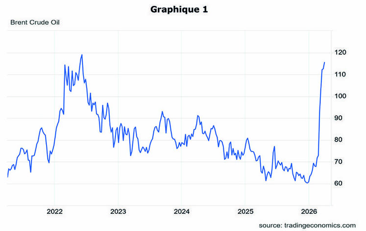 "Le conflit en Iran a subitement rehaussé le prix du baril de Brent. Durablement situé dans une fourchette de 60-80 dollars, il s’est hissé à partir de la fin du mois de février aux alentours de 100-115 dollars. Le cours du baril de pétrole est désormais à proximité du niveau qui était le sien lors du déclenchement de la guerre en Ukraine en février 2022 (graphique 1). On remarquera sur le graphique que le prix du baril se situait à 55 dollars en décembre. Un cours moyen de 60-80 dollars ayant fortement contribué à la désinflation durant les années 2024-2025."