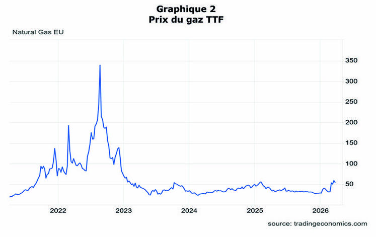 "Paradoxalement, le prix du gaz, ici le TTF, référence sur le marché européen, ne connaît pas de hausse soudaine, comme ce fut le cas en février 2022. Il est à 55 euros/MWh, ce qui est peu, comparativement à la période de guerre en Ukraine, et aussi en raison des besoins des économies occidentales (graphique 2). Il faut y voir sans doute un effet d’une demande moins forte exprimée par les principaux pays importateurs. Toutefois, il est impératif de surveiller l’évolution du prix du gaz TTF, qui pourrait suivre le mouvement haussier dans les prochaines semaines si le conflit perdurait et si le détroit d’Ormuz était encore obstrué."