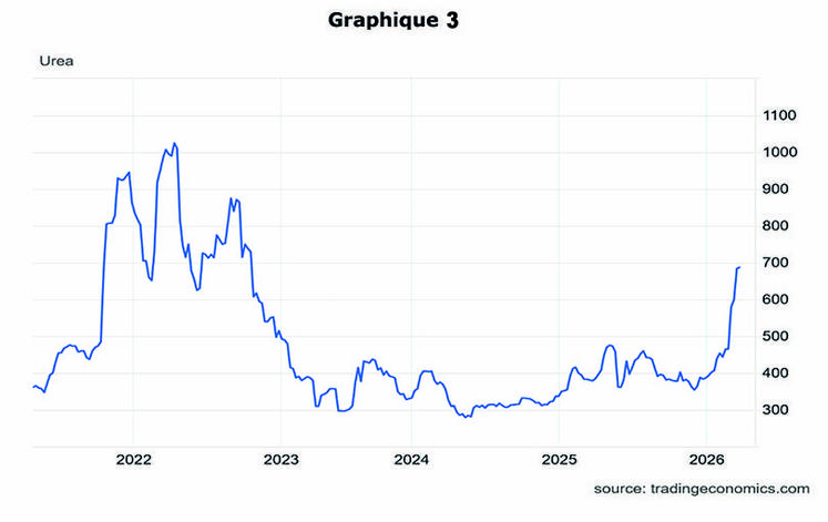 "Il n’en reste pas moins que, si l’UE n’est pas la zone la plus exposée au risque de la poursuite de la fermeture du détroit d’Ormuz, et donc à la contraction de ses approvisionnements, elle est percutée de plein fouet par la hausse régulière depuis le début du conflit du prix de l’urée (graphique 3). Comme dans le cas du gaz, si le prix de l’urée augmente – il était à quelque 725 euros la tonne le 30 mars contre 575 à la veille de la guerre – il se situe encore au-dessous du pic des 1 000 euros la tonne observée durant les trois premiers mois de la guerre en Ukraine.