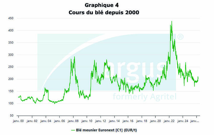 "Tout va donc dépendre de l’évolution du prix des produits agricoles, et en particulier de ceux des céréales. À l’inverse de ce qui s’est produit lors du début de la guerre en Ukraine, où le cours du blé tendre avait atteint un pic inédit, permettant aux producteurs d’absorber l’envolée des coûts de l’énergie et des engrais, la conjoncture actuelle reste précaire pour les agriculteurs. À cette époque, le prix de la tonne de blé était plus de deux fois supérieur à ce qu’il est aujourd’hui (graphique 4). Le ratio solution azotée prix du blé se situe à 2,12, signifiant que le cours de l’engrais est plus de deux fois plus élevé que celui du blé tendre. C’est pourquoi la problématique de la compensation d’une nouvelle dégradation des trésoreries se pose. Quels sont les leviers pour couvrir les pertes, sur quel pas de temps doivent-ils se situer, et sur quel périmètre doivent-ils être définis et appliqués, l’UE et/ou les États membres ?"