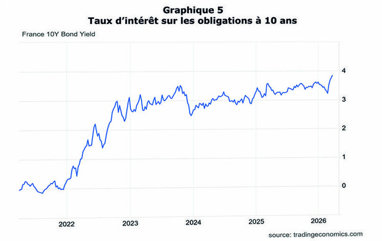 "Si l’on se situe sur le registre des États membres, il est clair que les marges de manœuvre de la France sont réduites. On peut en avoir un aperçu en consultant l’état du déficit budgétaire national (- 5,1% du PIB), et de l’endettement français (- 113% du PIB). Avec la guerre en Iran, les marges de manœuvre du gouvernement français sont manifestement sous la surveillance des marchés financiers. Le taux d’intérêt des obligations à 10 ans, qui affecte les titres émis par l’État, a grimpé au voisinage de 4 % (3,83 % le 30 mars), traçant une perspective d’alourdissement de la charge financière pour le gouvernement français, qui aurait pour conséquence de restreindre les marges de manœuvre du gouvernement en matière de politique économique (graphique 5).
