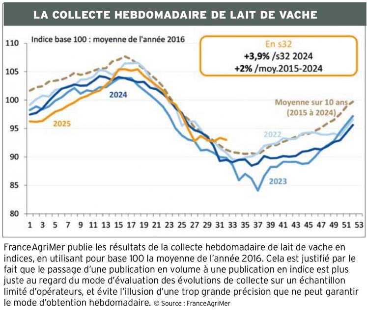 En France, la collecte a récemment progressé de + 2,1 % par rapport à la dernière semaine de juin 2024. La collecte a ainsi reculé en juillet (- 0,6 %/2024), puis s'est nettement redressée début août (+ 3,9 % en s32), avant l'irruption de la canicule.