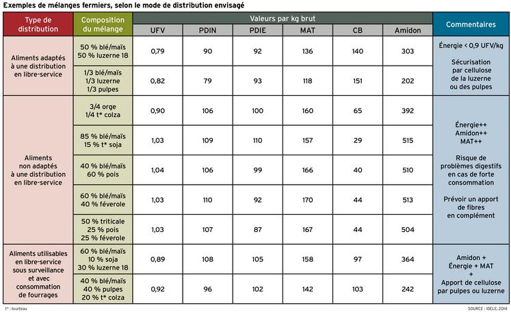 La composition du concentré à distribuer doit normalement tenir compte de la disponibilité et de la qualité du fourrage qu'il reçoit par ailleurs. Elle devrait donc se raisonner selon la qualité de l'herbe (abondante et feuillue, sèche et fibreuse...). Mais souvent pour des raisons de simplification du travail, le même aliment est distribué sur toute la campagne de pâturage.