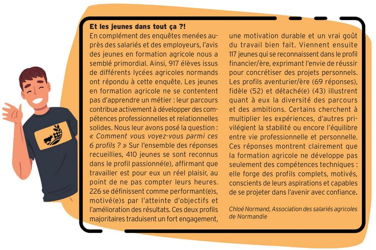 Dans le cadre du Contrat d’objectifs porté par la Région Normandie sur le thème de la gestion prévisionnelle des emplois et des compétences (GPEC), l’Association des salariés agricoles de Normandie, la Chambre d’agriculture de Normandie, EDT Normandie, la FRSEA Normandie, l’UNEP, Activ’Emploi ainsi que l’Anefa ont conduit des enquêtes pour mieux comprendre les attentes des salariés vis-à-vis de leur emploi et de leurs employeurs, ainsi que celles des employeurs envers leurs salariés.