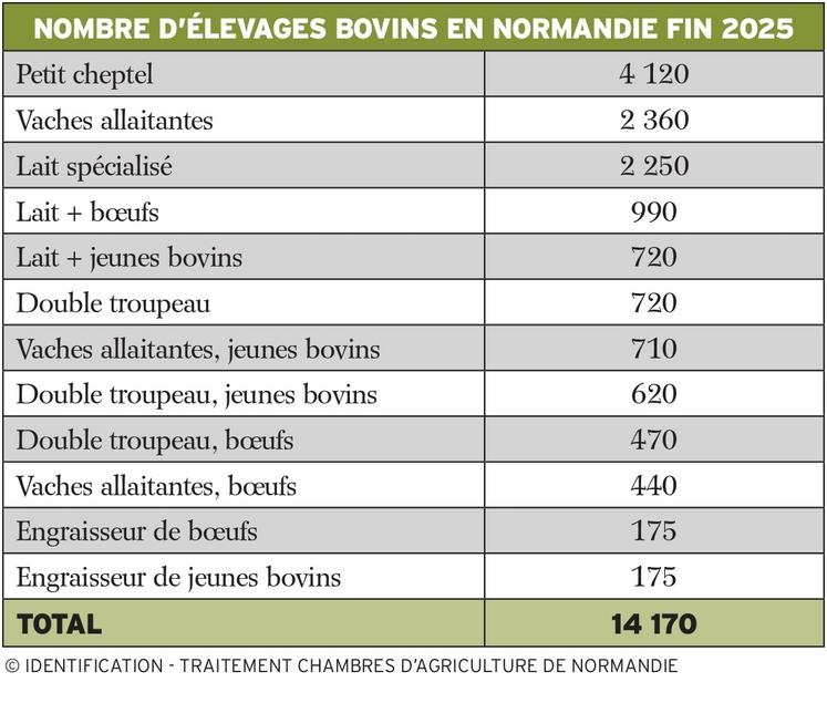 Au cours de 2025, le cheptel bovin normand a perdu plus de 45 100 têtes. Cette baisse résulte de 701 700 naissances (en baisse de 1,6 % par rapport à 2024), de l'achat de 242 400 bovins vivants par les éleveurs normands (- 2,5 % par rapport à 2024), de la vente aux abattoirs de 489 100 bovins (- 3,4 %), de la vente en vif de 313 900 bovins (- 0,5 %) et de la mortalité qui est de 186 300 têtes en 2025, en hausse de 2,1 % par rapport à 2024. Cette recrudescence inhabituelle de la mortalité trouve une explication dans les épizooties à répétition qui ont affecté le cheptel bovin en Normandie.