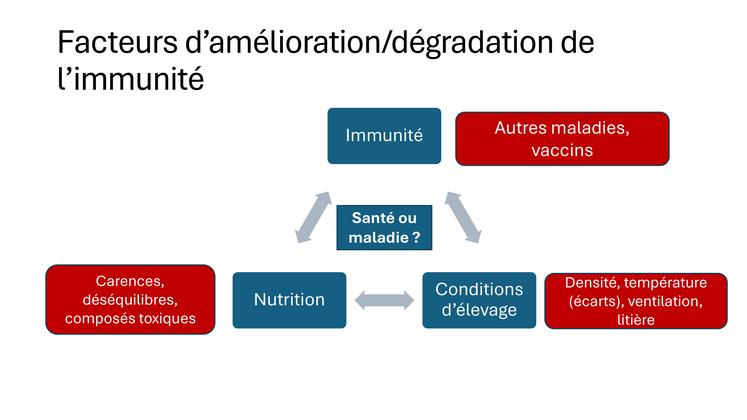 - Alimentation : c'est la variable que l'on doit surveiller de très près. La ration doit être équilibrée par des apports protéiques et énergétiques suffisants, des minéraux, des oligo-éléments et des vitamines. Ils interviennent dans les mécanismes physiologiques immunitaires : une carence affaiblit donc l'animal qui est plus sensible.