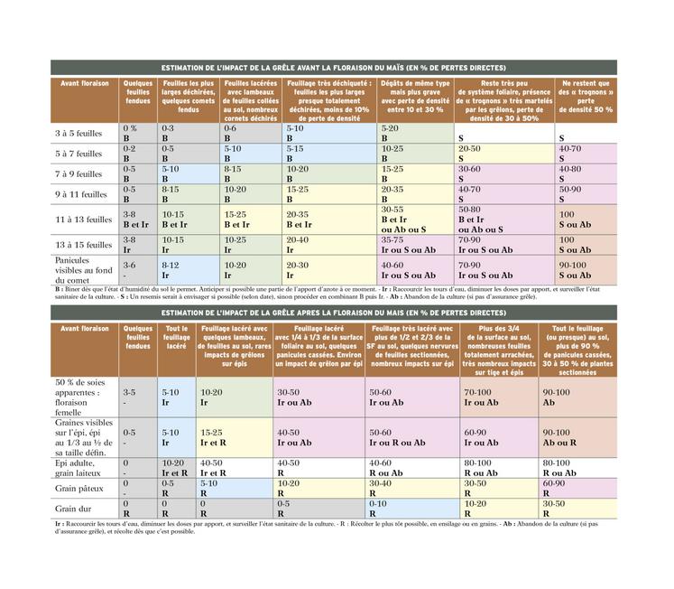 Les deux tableaux ci-contre donnent des estimations de l'impact de la grêle en fonction des niveaux de dégâts et des stades du maïs. Ils donnent aussi des pistes pour accompagner la conduite des parcelles de maïs touchées.