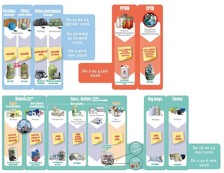 D’autres collectes sont organisées du 18 au 22 mai et du 2 au 6 novembre : bidons en plastique, bouchons et opercules de produits phytosanitaires, sacs et boîtes de produits phytosanitaires, sacs en plastique et sacs en papier, big-bags.