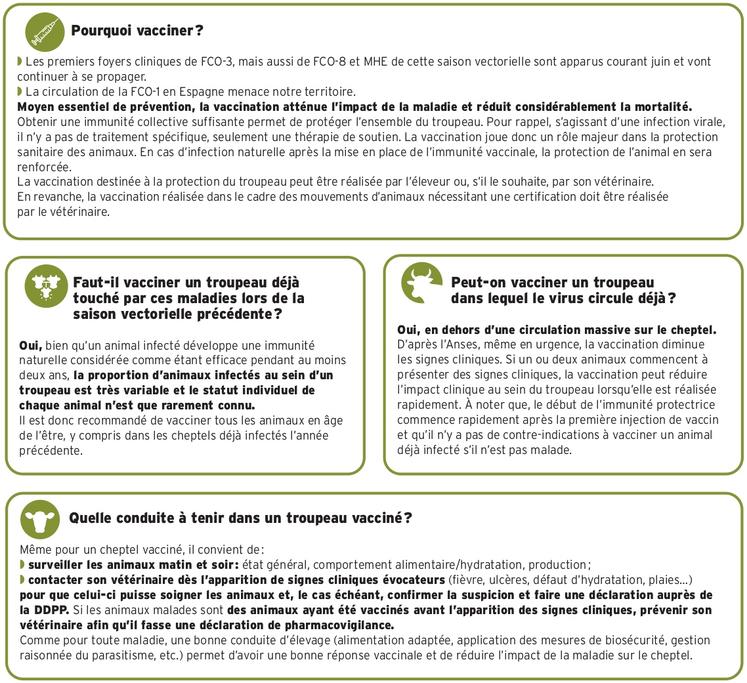 Face à la diffusion forte du virus de FCO-3, le seul moyen de lutte efficace permettant de diminuer l'impact de la maladie est la vaccination. Cette dernière, complétée d'une bonne gestion de l'immunité du cheptel (alimentation adaptée, gestion du parasitisme…), permettra de limiter l'impact de la maladie sur le troupeau.